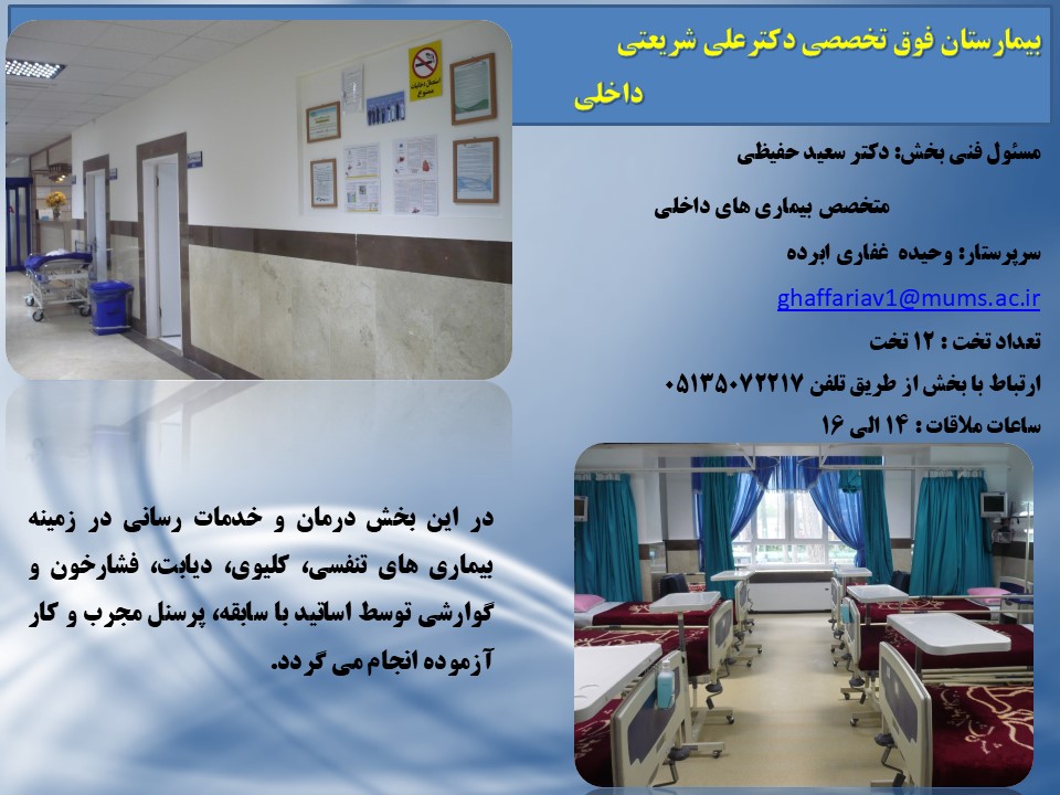MUMS 1بخشهای درمانی 14 مهر 1396 بازدید: 2818 امتیاز: ( 0 Rating ) بخش داخلی امتیاز کاربران لطفا رای دهید رای 1 رای 2 رای 3 رای 4 رای 5