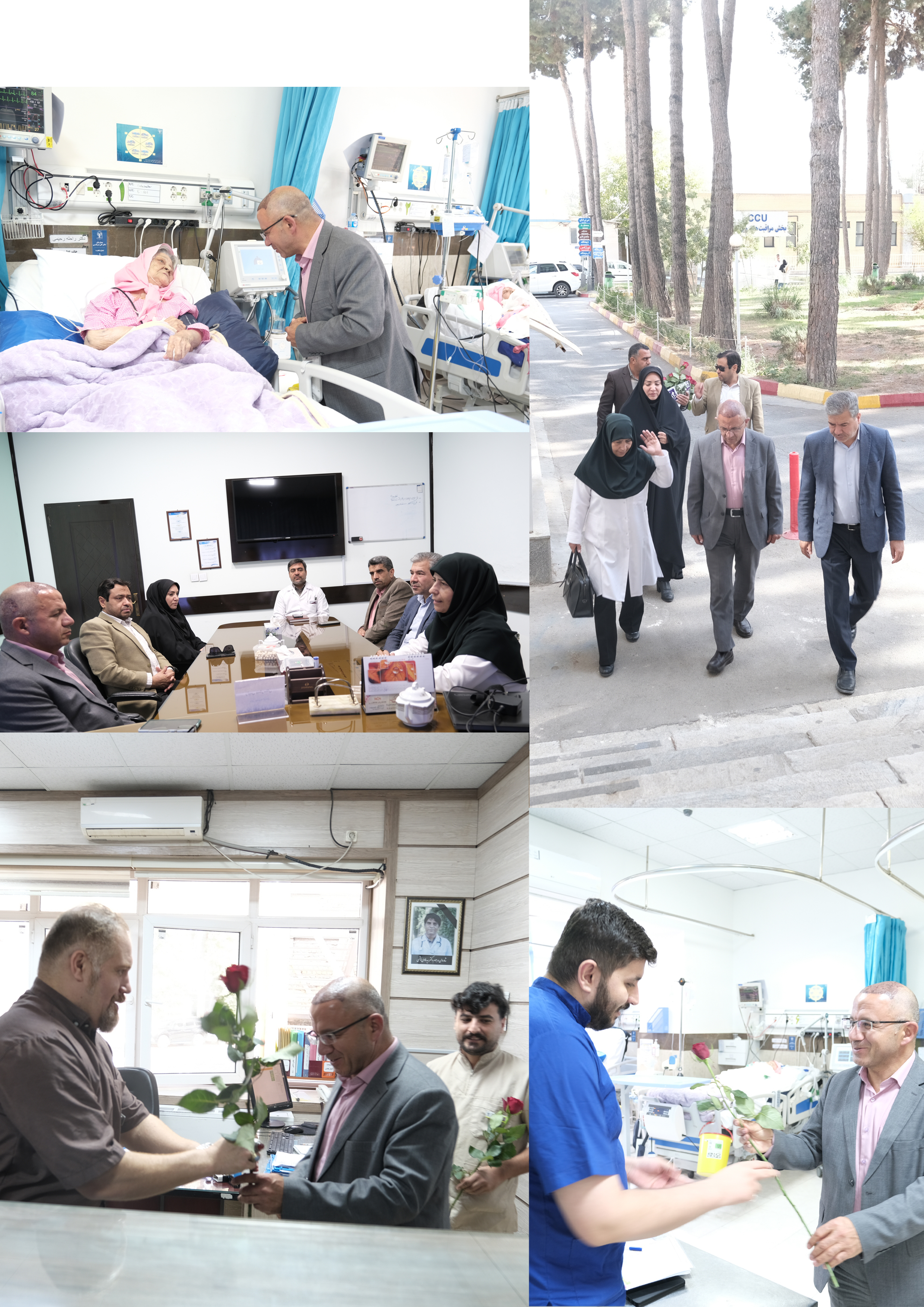 دیدار فرماندار محترم شهرستان طرقبه و شاندیز جناب آقای بشکنی با خانم دکتر الوندی سرپرست بیمارستان، آقای دکتر منفرد و آقای محسن زاده امروز آقای بشکنی با حضور در دفتر رئیس بیمارستان مهمان رئیس و مدیر بیمارستان بودند که در زمینه ظرفیتهای بیمارستان در پوشش دهی خدمات درمانی منطقه و استفاده از قابلیتهای موجود صحبت کردند. ایشان در ادامه حضور در بیمارستان از تعدادی از بخشهای درمانی دیدن کرده و با اهدای شاخه گل به همکاران بخشهای درمانی روز پرستار را به آنان تبریک گفته و خدمات ارزشمند آنان را ارج نهادند