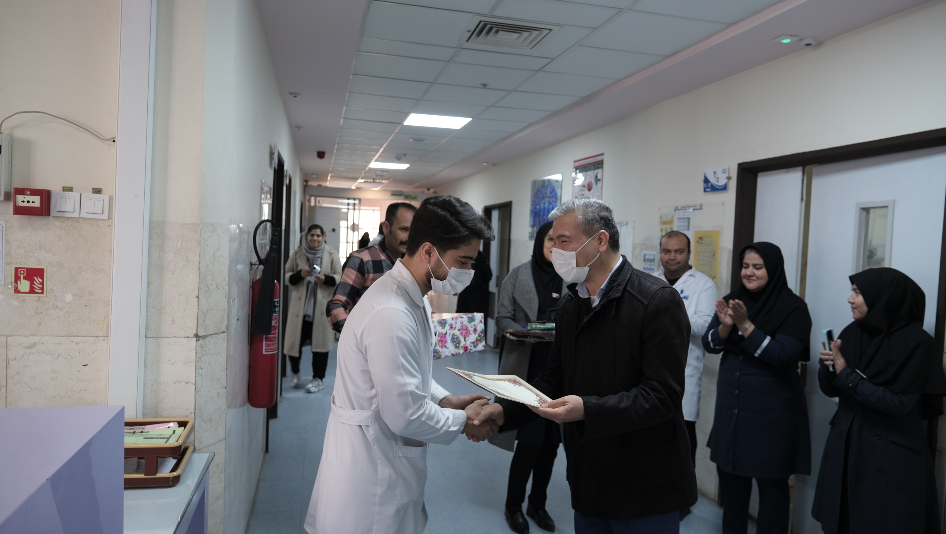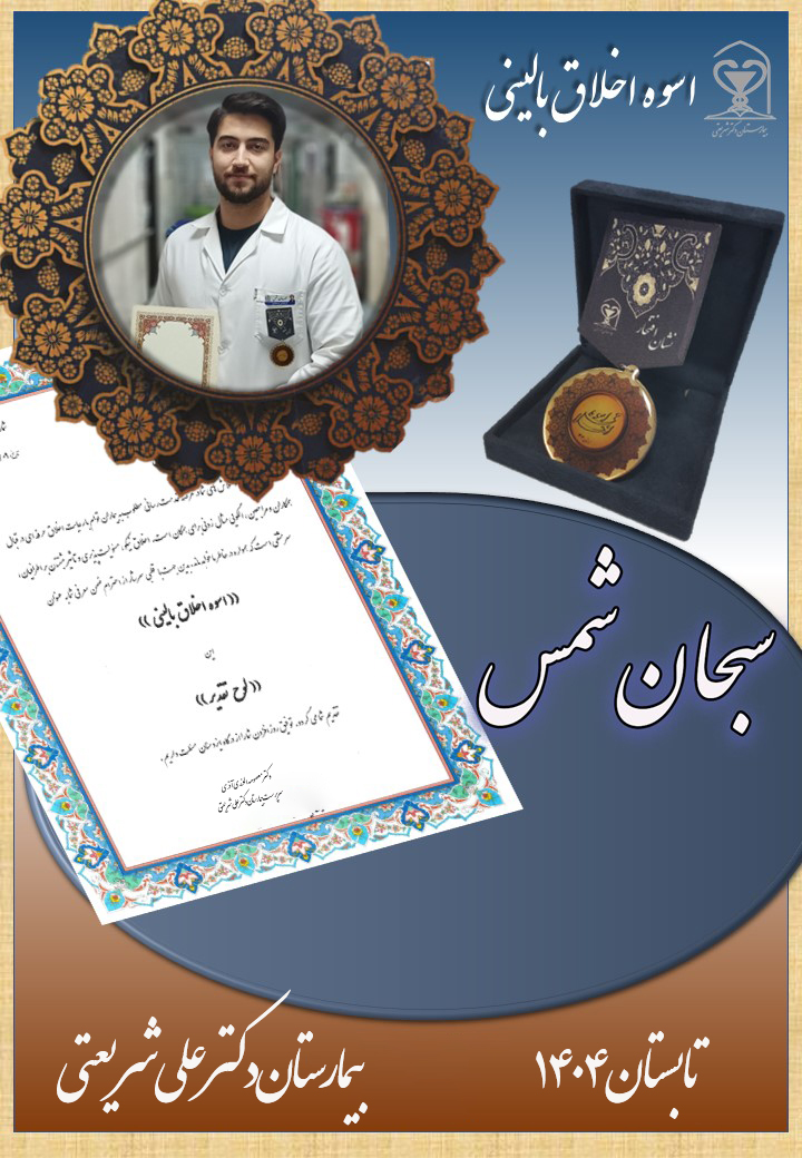 امروز یکشنبه 7 دی 1404 خانم دکتر الوندی سرپرست محترم بیمارستان به همراه دکتر منفرد مدیرمحترم بیمارستان،آقای محسن زاده مسئول محترم حراست ، آقای سرحدی مدیر محترم پرستاری و جمعی از همکاران با حضور در بخش جراحی مردان ، انتخاب شایسته آقای شمس بعنوان اسوه اخلاق سه ماهه تابستان 1404 را به ایشان تبریک گفتند و با اهدای نشان افتخار و تقدیم هدیه ای به رسم یادبود ، از زحمات ارزشمند ایشان تقدیر کردند.