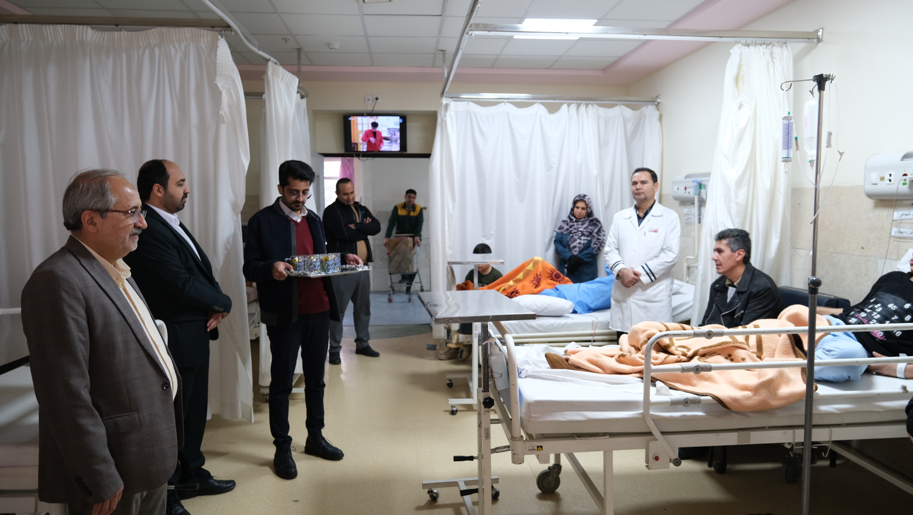 حضور جمعی از بنکداران قماش و بازاریان مشهد در بیمارستان شریعتی در روز عید نیمه شعبان و ولادت حضرت مهدی (عج)